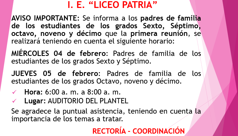 Se informa a los padres de familia de los estudiantes de los grados Sexto, Séptimo, octavo, noveno y décimo que la primera reunión, se realizará teniendo en cuenta el horario asignado.