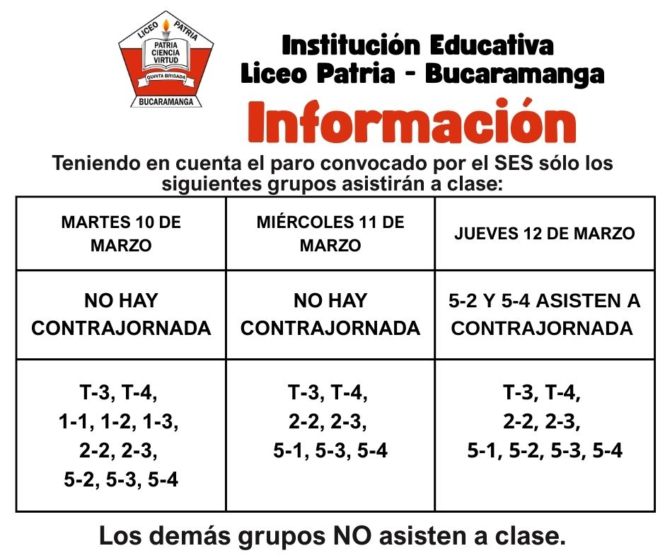 Cordial saludo, debido al paro de 72 horas, se presenta el siguiente horario de clases para los grupos que deben asistir.