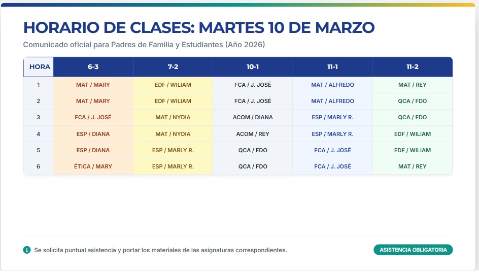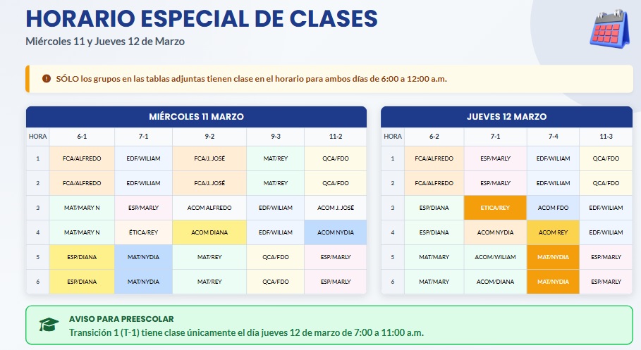 HORARIO ESPECIAL PARA LOS DÍAS MIÉRCOLES 11 y JUEVES 12 DE MARZO DE 2026 IMPORTANTE: EL JUEVES 12 DE MARZO LAS CLASES INICIAN A LAS 6:00 A.M.
