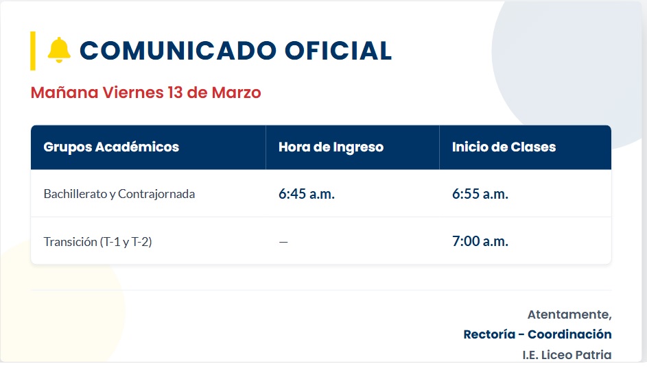HORARIOS DE INGRESO E UNICIO VIERNES 13 DE MARZO INFORMACIÓN IMPORTANTE