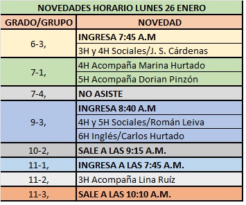 Debido a incapacidades médicas y día compensatorio de varios docentes, se informa que el HORARIO DEL DÍA LUNES 26 DE ENERO, tiene las siguientes NOVEDADES: